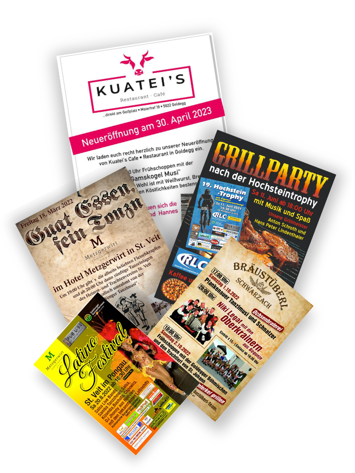 Plakate, Flyer, Eintrittskarten, Broschüren, Speisekarten, Aufsteller, Beachflags, Roll-Ups, Großflächendrucke wie Banner & Baustellen-Banner